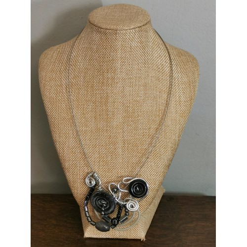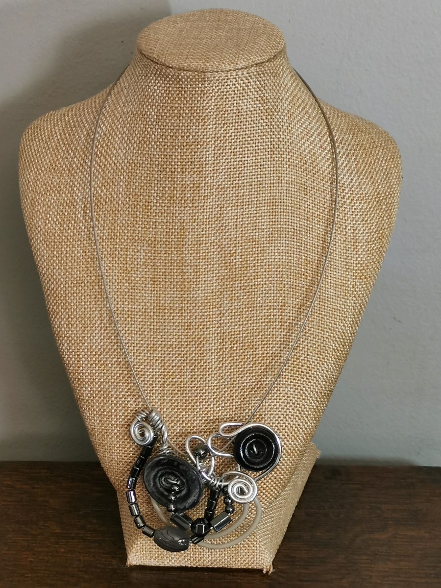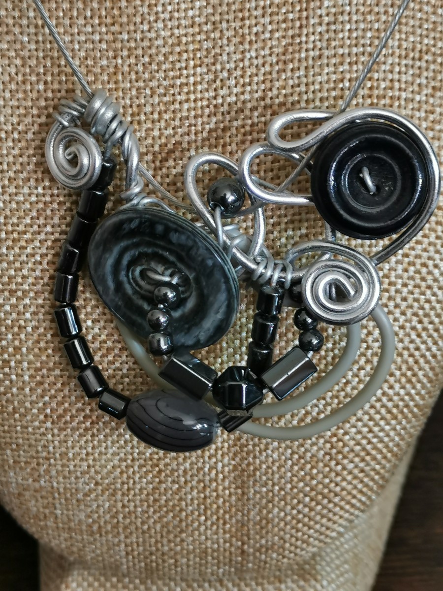 collier avec véritables pierres : hématite, orné egalement de boutons et perle plastique.