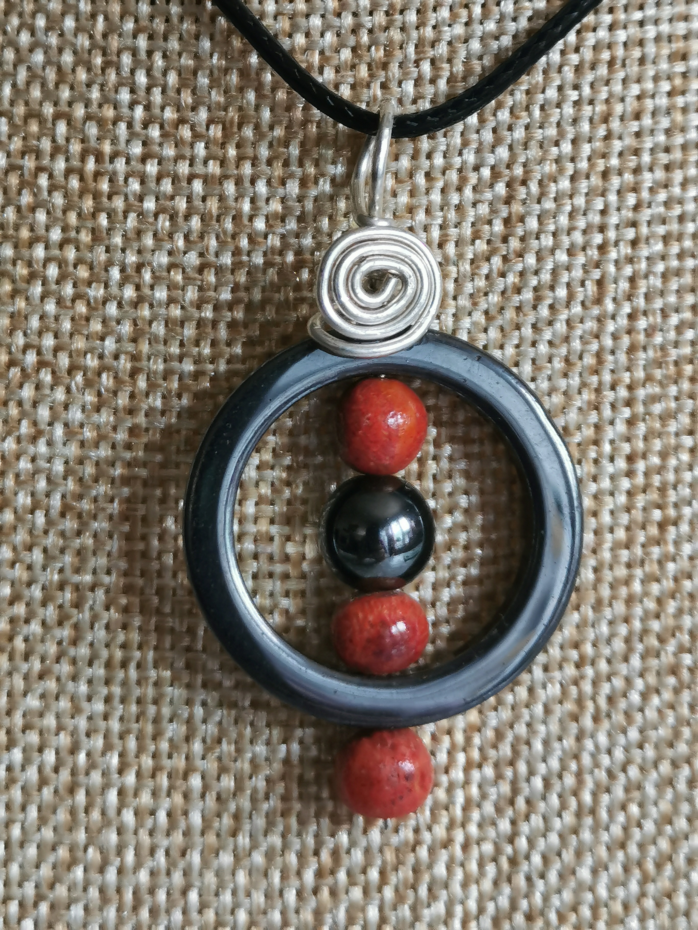 pendentif artisanal en corail gorgone, hématite et argent plaqué 20 microns avec cordon réglable en hauteur
