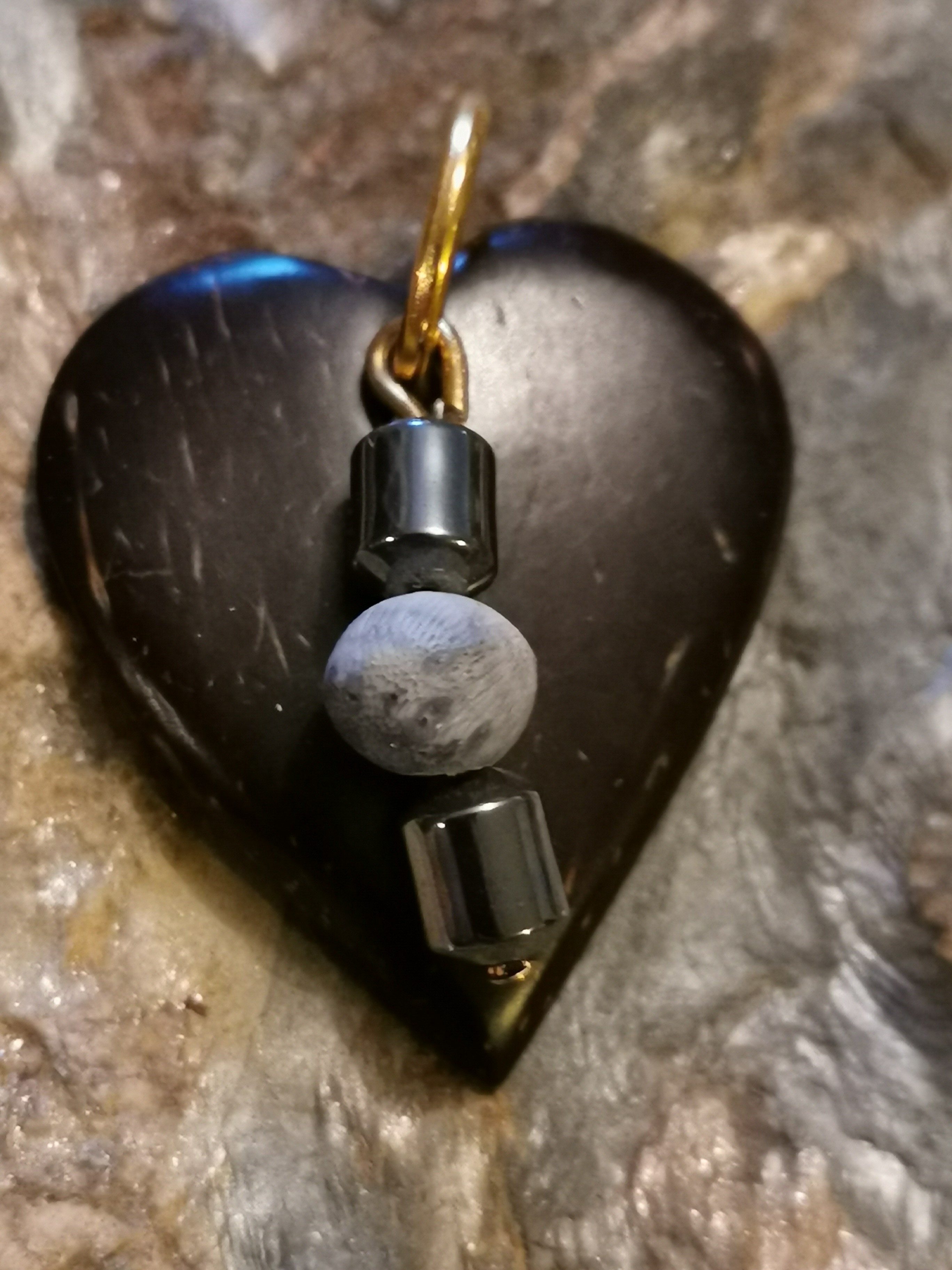 Pendentif en corail bleu et hématite, laiton et bois. avec cordon réglable en hauteur